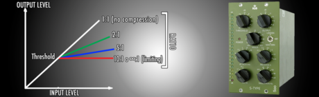 en la imagen es representada gráficamente la incidencia de la compresión por el mando de RATIO, (derecha), mostrando que al aumentar de tal parámetro aumenta la «fuerza» de compresión. A izquierda un compresor analógico.