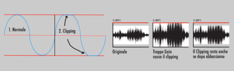Aquí izquierda nos vemos como un volumen en entrada demasiado elevado crea el clipping perdiendo partos de señal audio. A derecha, la primera representa un expediente audio correctamente registrado, la segunda una grabación comprometida por un volumen demasiado elevado y la tercera explica como tal señal ya compromiso no podrá ser arreglado en nuestra DAW.