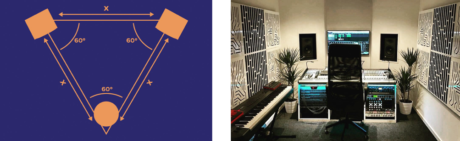 La posición optimal por un estudio de producción está con los dos monitores sobre los dos esquinas del triángulo inclinados hacia el interior y el producer hacia la tercera esquina.