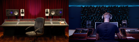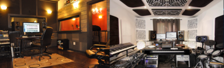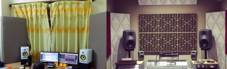 La imagen de izquierda representa la posición optimal del Producer – en la imagen de derecha los paneles trato acústicas paredes laterales profesionales.